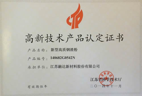 2014年11月3日,從江蘇省科技廳傳來喜訊,江蘇融達新材料股份有限公司的“新型高質鋼渣粉”正式通過江蘇省高新技術產品認定,獲江蘇省高新技術產品稱號。